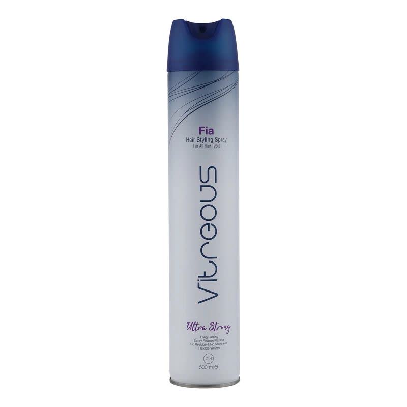 اسپری حالتدهنده مو ویتروس مدل فیا 500 میل با تثبیت قوی، افزایش حجم و درخشندگی طبیعی، بدون چسبندگی و مناسب انواع موها.